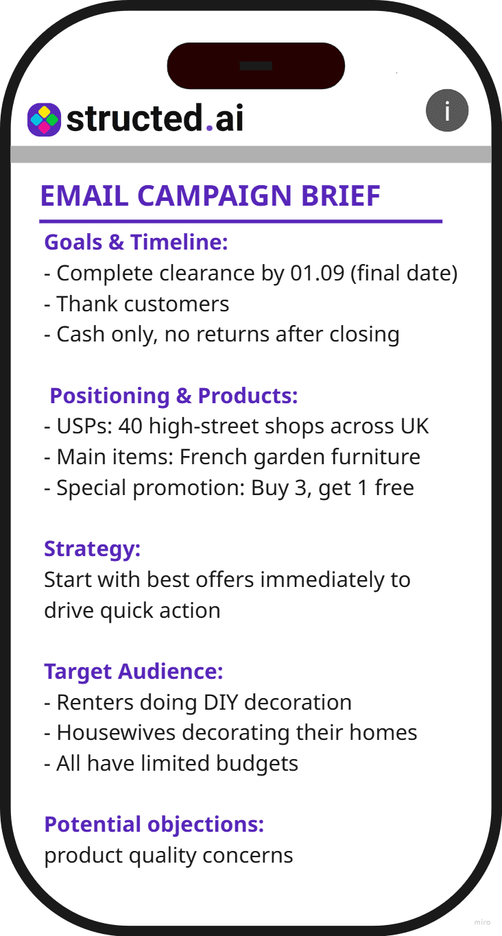 Structed is built on a sophisticated Multi-Agent AI Architecture that replicates the workflow of a senior marketing team. Instead of a linear script, it uses: Deep Interview Techniques: Our AI employs professional laddering and probing methods to uncover the "why" behind every client request, just like a human strategist would. Marketing Mix Integration: The system is pre-trained on 4P/7P frameworks, Jobs-to-be-Done (JTBD), and consumer behavior psychology to ensure no critical business detail is missed. Real-time Idea Generation: Using its multi-agent brain, Structed cross-references client answers with industry benchmarks to suggest creative directions and solutions during the talk. Autonomous Synthesis: It filters out the "fluff" and noise, focusing only on the strategic insights needed to create a ready-to-execute brief.